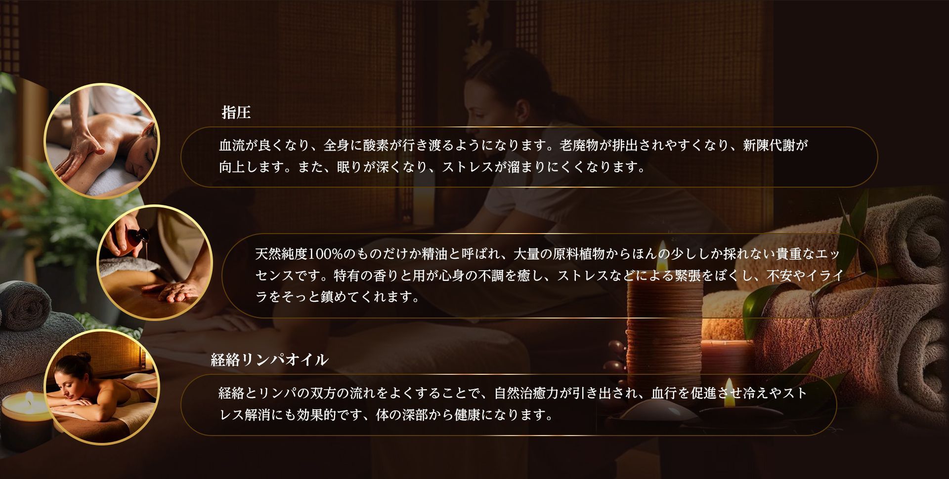 アロマの香りや癒される音楽の中で、丁寧かつゆっくりとできる心を込めたマッサージで、お客様には、あらゆるストレスから解き放たれ、満足していただけることをコンセプトとし、身も心もリラックスできる上質で最高の癒しをご提供いたします。スタッフ一同、皆様のご来店を心よりお待ち致しております。